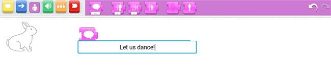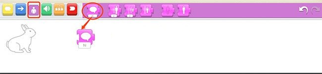 让兔子在跳舞前说点什么,可以使用紫色块添加字符的语音泡泡。点击块区域中的紫色按钮来显示外观块,把说话模块拖到脚本区