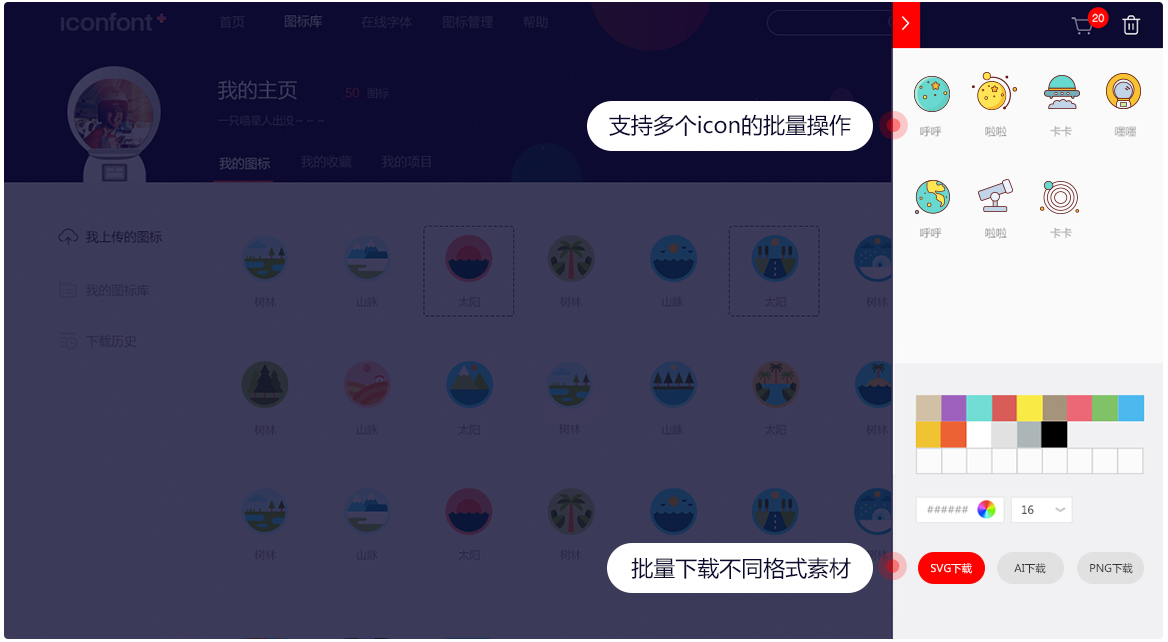 购物车:将图标加入购物车后,可以批量下载素材和代码、批量添加至项目