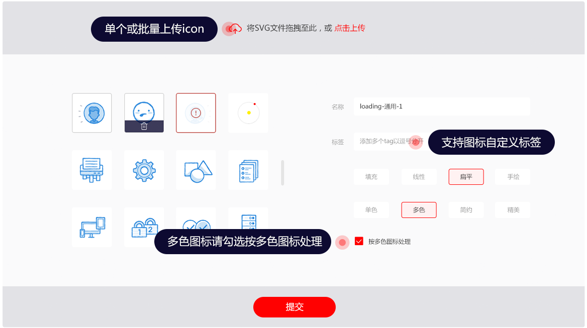 上传:支持单个或批量上传多个icon、支持单色/多色icon同时上传、支持图标自定义配置标签