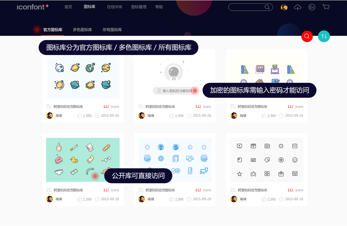 图标库:系列相关图标的集合,由图标上传者创建,需通过审核才可公开/加密访问图标库分为官方图标库/自定义图标库/多色图标库