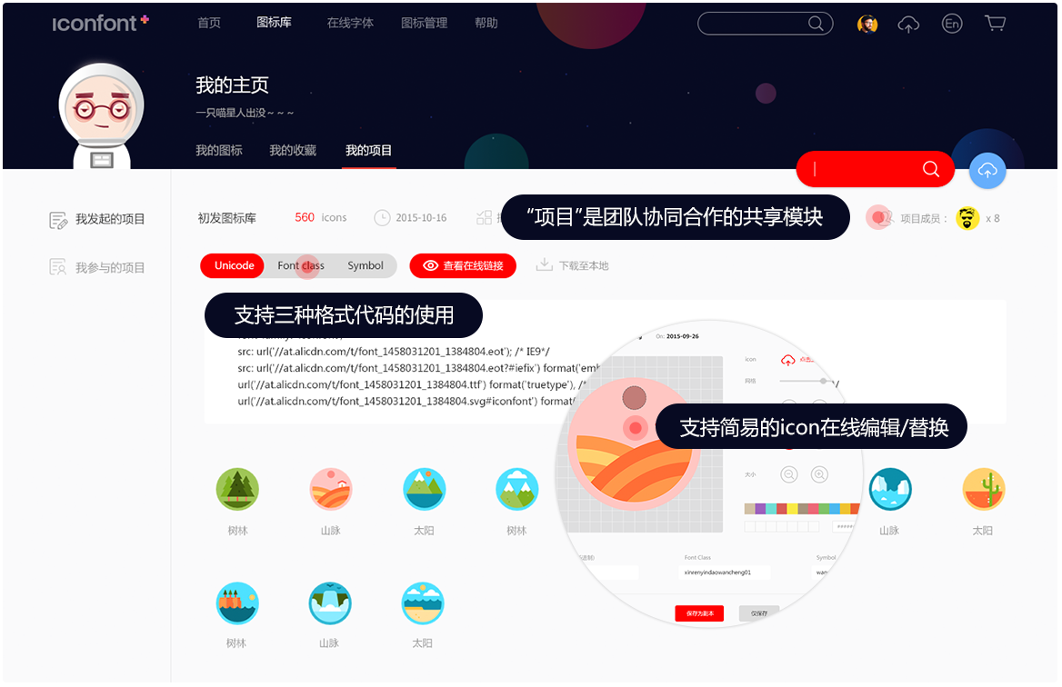 项目管理:“项目”是帮助团队协同合作的共享模块,创建项目后,视觉同学上传icon,交互/产品同学可以?自由下载图标,前端同学可以将图标以字体格式添加至代码,支持三种格式代码使用。