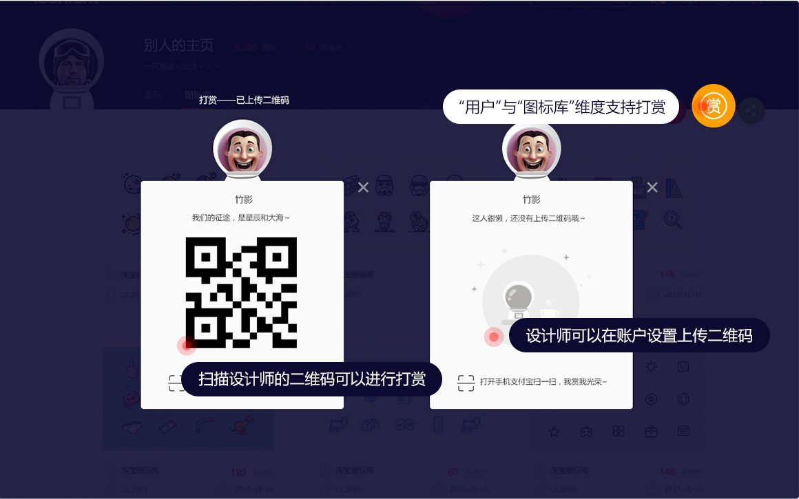 打赏:支持原创图标,尊重设计成果,在“用户”与“图标库”维度支持打赏,如果你喜欢哪位设计师,赶快去打赏吧~