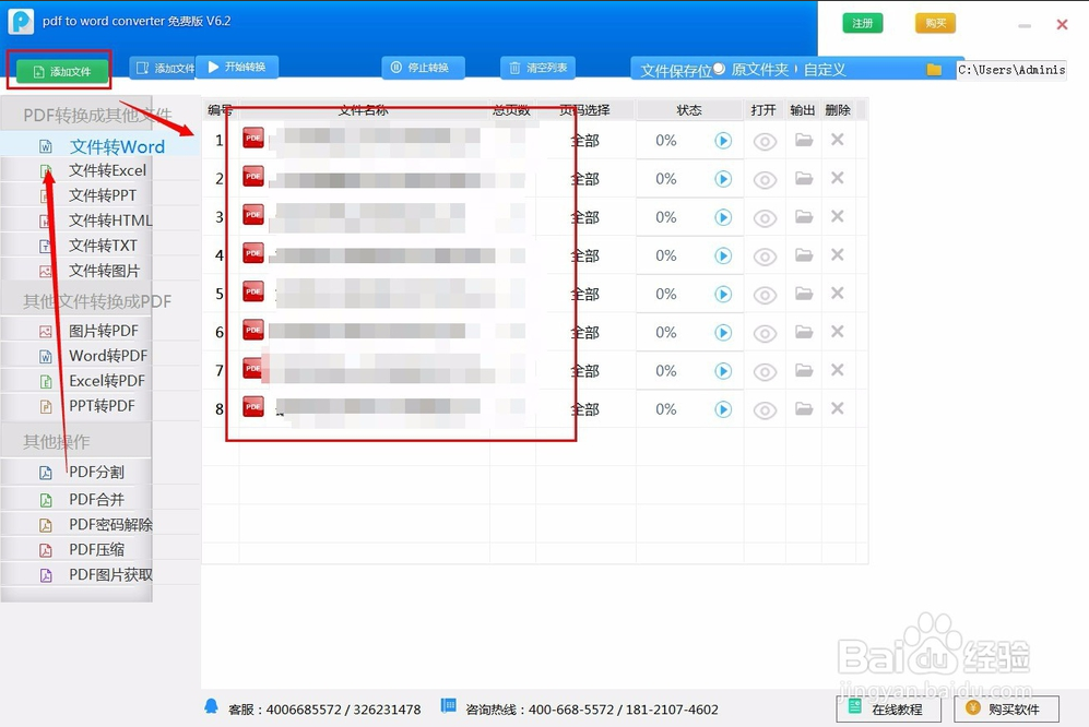 4、点击左上角的“添加文件”按钮,把所有要转换的PDF文件上传进来;