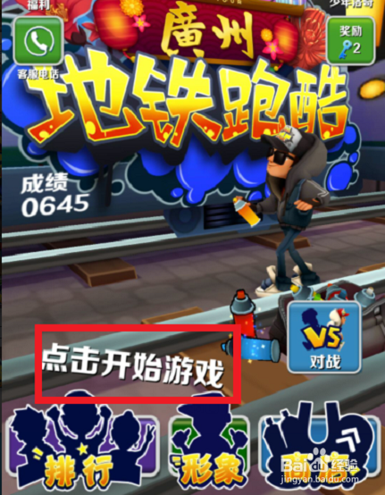 1、进入“地铁跑酷”界面后,在跑道中选择适手的人物,画面内点击开始游戏的字样。