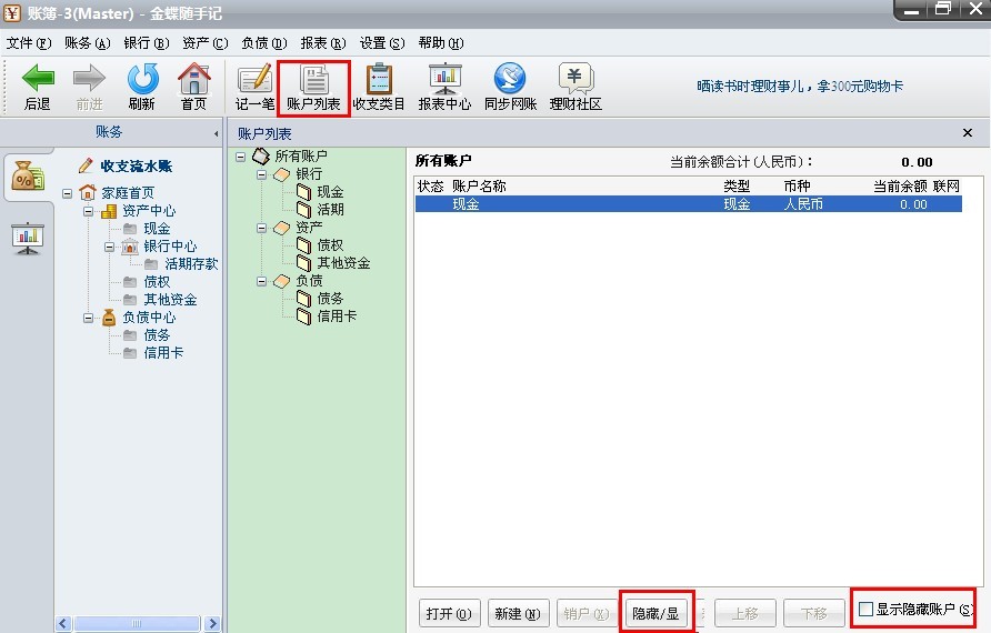 进入随手记PC,点击标准按钮栏上的“账户列表”,进入账户列表页面。选择需要隐藏的账户,点击下面的“隐藏/显”按钮,该账户即会隐藏。若需要显示之前隐藏的账户,勾选右下角“显示隐藏账户”即可。