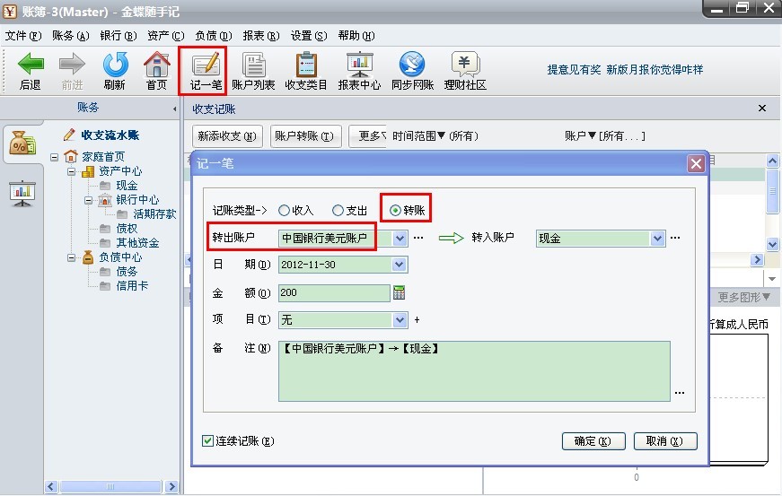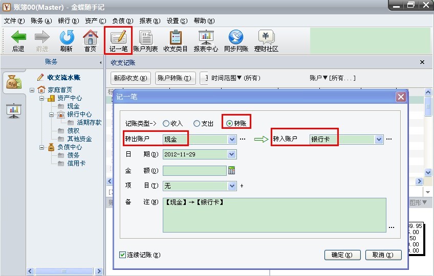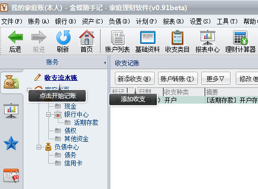 1、点击标准按钮栏上“记一笔”,出现记一笔页面,点击“转账”,选择转账账户,录入转账金额等,确定,即完成一笔转账记录。