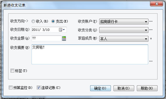 2、在记账界面中,选择刚才建立的招商银行卡账户进行记账