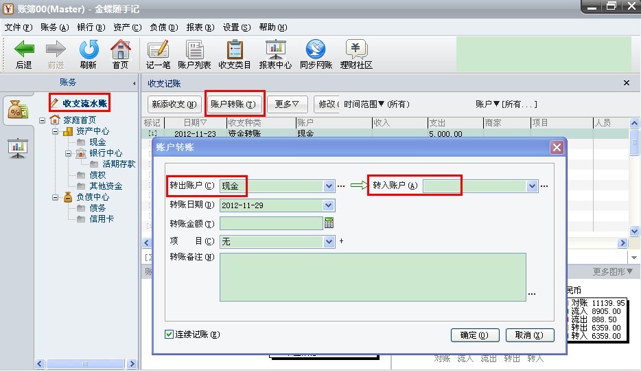2、也可以,点击“收支流水账”,选择“账户转账”,出现账户转账信息页面。选择转账账户,录入金额等,点击“确定”,即完成一笔转账记录。