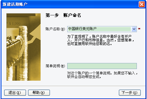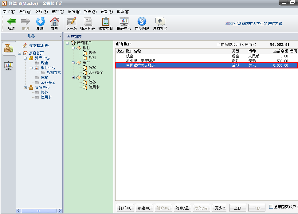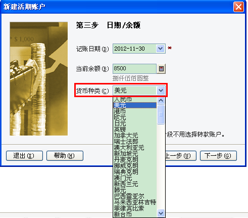 1、首先需要新建外币账户,“账户列表”——“新建”,选择您想要的币种,然后录入初始余额。 例如新建美元账户: