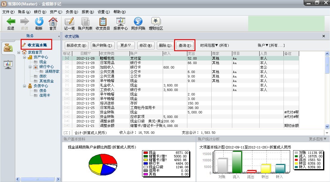 在随手记PC页面,点击左上方“收支流水账”,即可查看记账流水。也可以点击“查询”按钮,选择需要的流水进行查看。