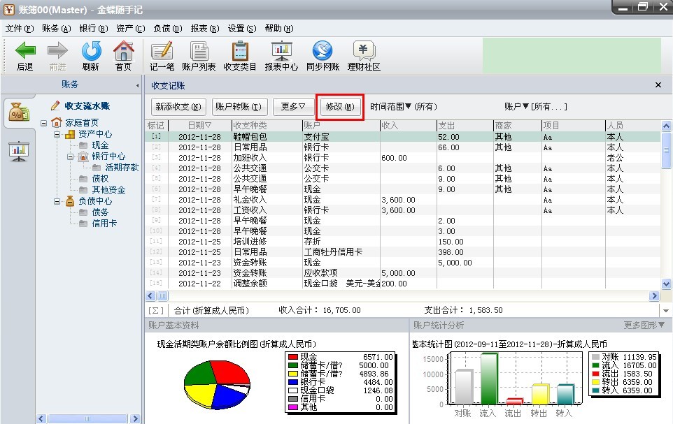 另外,如果需要修改流水,选中需要修改的流水,点击流水页面“修改”,可修改此记账流水。点击“删除”,此流水记录将会被删除。