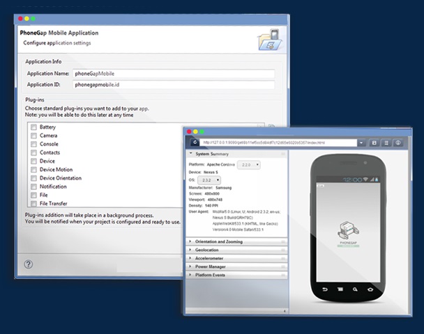 支持为Android和iOS开发基混合原生应用模型的PhoneGap移动应用,包括访问和编码设备功能的插件API。