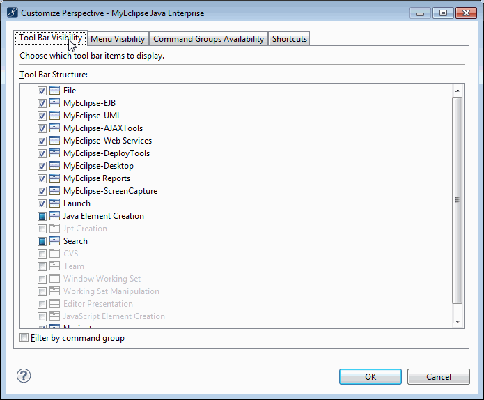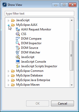 由于screen real-estate的限制,不可能整合MyEclipse视角内的所有MyEclipse的视图和编辑器。想要查看所有的MyEclipse视图,从 菜单中选择Window>Show view>其他,可以扩展任何MyEclipse视图。如下所示的一个视图列表例子。