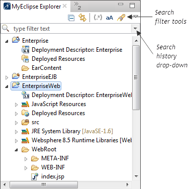 MyEclipse的资源管理器视图在MyEclipse的视角默认浏览器中,该视图提供快速访问相关项目其他文件的功能。此资源管理器视图还包含高级搜索功能,如果搜索文本区分大小写,可输入过滤文本并指定搜索是否是正则表达式、文件名或文件内容。