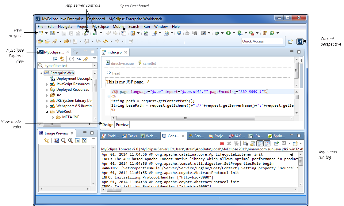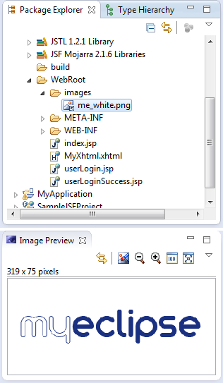 MyEclipse中提供了一个视图选项允许您浏览图片文件夹(通过在Package Explorer),不用在一个单独的图像编辑器中打开它们来显示图像。图像预览选项提供了基本的放大/缩小图像的浏览,支持GIF,JPG,BMP,PNG和ICO图像类型。