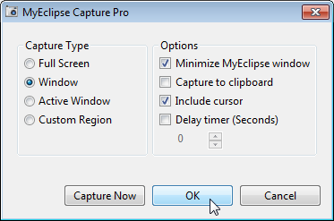 集成先进的屏幕捕获支持,可以让你抓取你桌面、窗口或一个区域的图像。此功能可以在Windows Vista,Windows7和Windows XP中使用。您可以将截图保存到Windows剪贴板或在MyEclipse的图像编辑器中打开。同时您可以设置屏幕捕获,包括您的光标。要想捕获屏幕图 像,单击工具栏上的屏幕捕获图标即可。