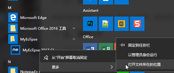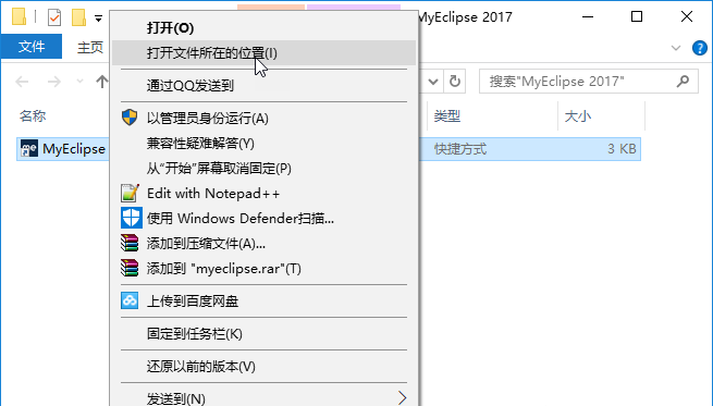 1.在开始菜单找到Myeclipse图标(小编是在win10中安装的),右键打开文件所在位置,发现只是一个快捷方式,继续右键打开文件所在位置,这时便找到Myeclipse安装所在位置(安装在其他盘的请直接找到安装位置)