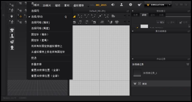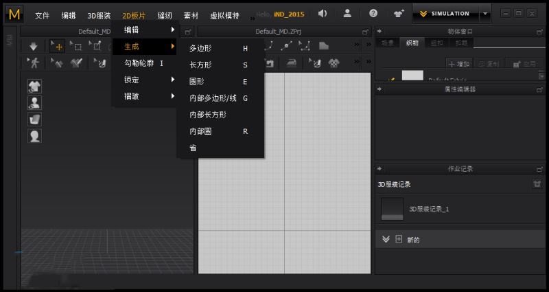 Marvelous Designer 4左上侧的是主菜单,为了更快捷的使用各种功能,3D服装窗口和2D板片窗口中都有鼠标右键弹窗选项。