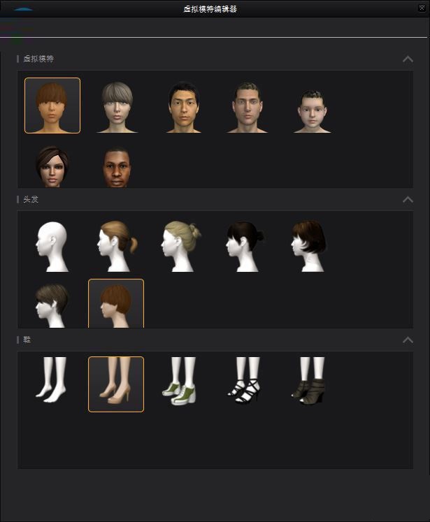 模特编辑器,此处能编辑虚拟模特的脸型、发型、鞋子等等信息,