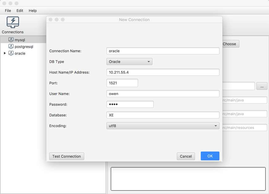 第一步: 首先点击左上角的Connections按钮新建数据库连接,在Connection Name输入框处填入一个好记的名字,比如mysql-local,然后其它字段像连接数据库一下,请参考如下图: 填好了所有字段可以先点击“Test Connection”看连接是否成功,如果成功保存连接则主界面左侧会生成一颗数据库连接数。