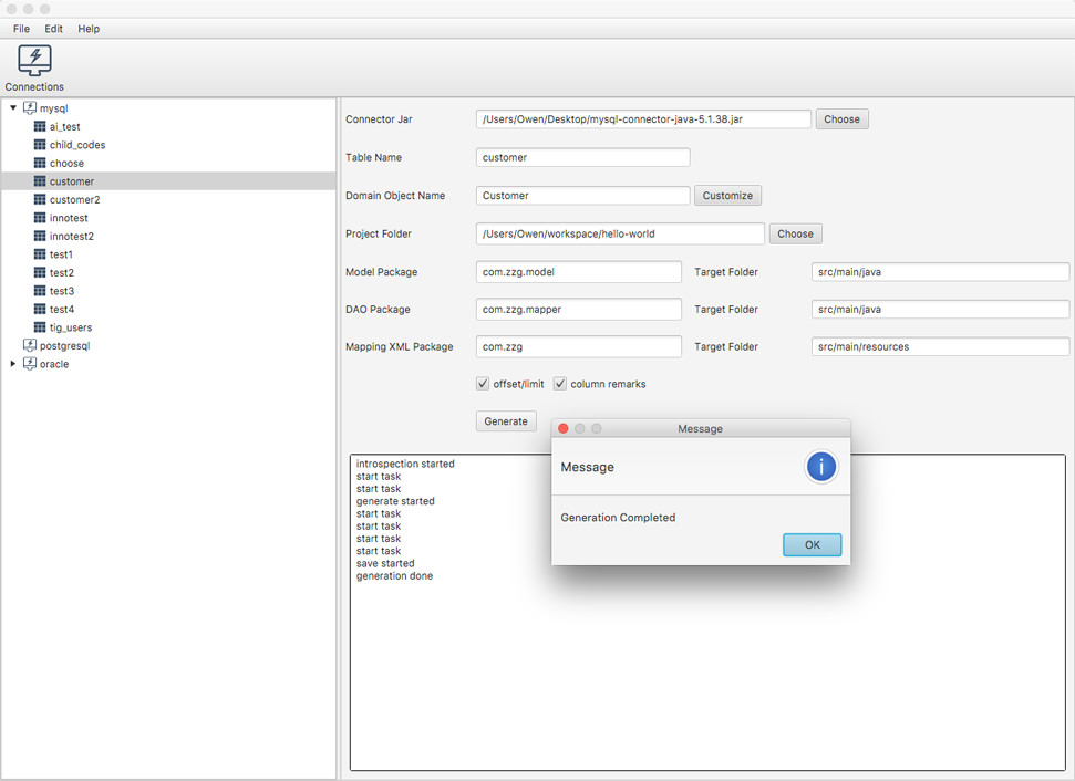 Eclipse or IntelliJ IDEA中启动, 找到com.zzg.mybatis.generator.MainUI类并运行就可以了