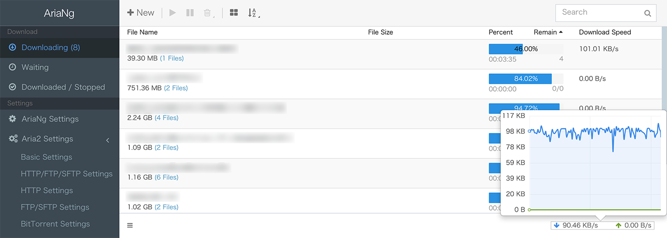 AriaNg是一个智能路由上bt、pt程序Aria2的前端。AriaNg使用纯html&javascript开发。所以其不需要任何编译器或运行环境。您只要将AriaNg放在您的Web服务器里并在浏览器中打开即可使用。AriaNg使用响应式布局,支持各种计算机或移动设备。【软件特性】