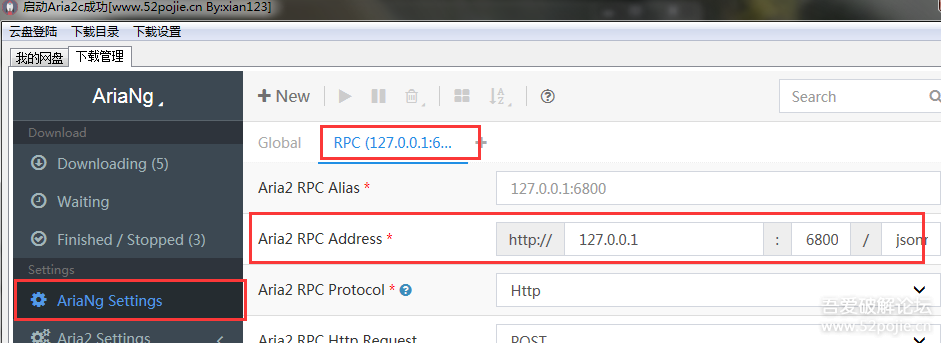 若下载管理页面显示连接出错,请尝试手动设置“127.0.0.1:6800”