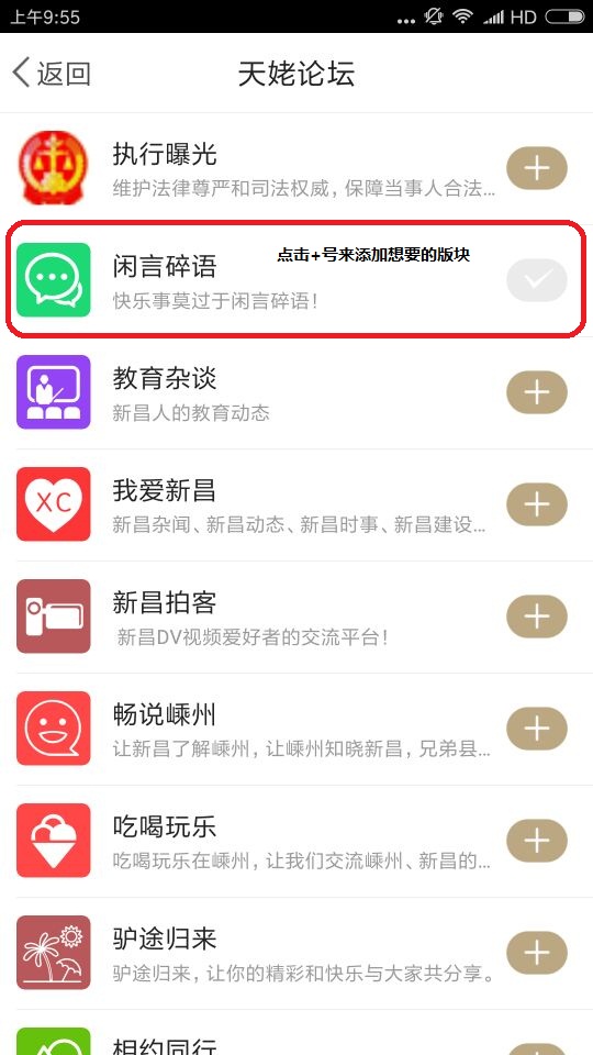 3.点击“+”号添加想要的版块,以闲言碎语为例