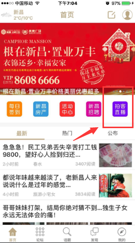 1.登入新昌信息港APP首页,选择拍客直播板块