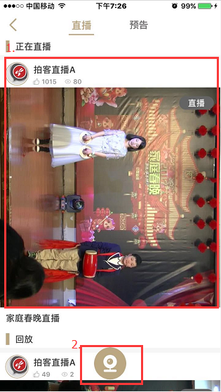 2.如果你要观看正在直播的,那么请选择想看的直播直接点击(如1所示)