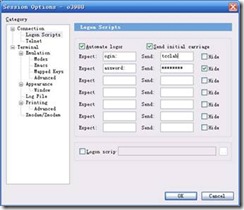 以登录一个Telnet的主机为例,Session ptions => Connection => Logon Scripts => Automate logon, 在login后的send中输入用户名,在Password后的send中输入密码。则可实现自动登录。