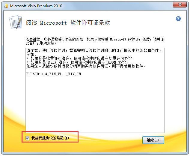 3、勾选“我接受此协议的条款”,点击“继续”;