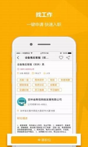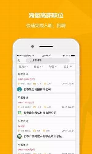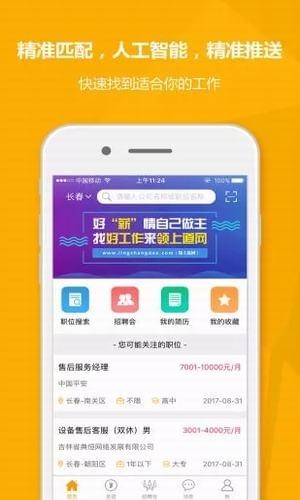 【创建简历】显示简历填写完整度,推荐简历匹配职位。【职位搜索】海量高薪职位,快速完成入职。