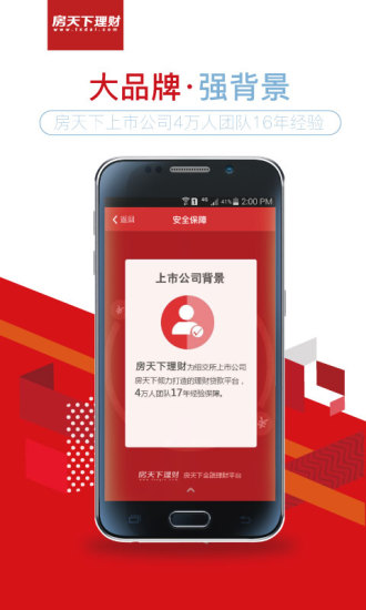 房天下理财是房天下控股旗下(SFUN)互联网金融服务网站,房天下理财定位于“网络借贷信息中介机构”,致力于为用户提供多元的投资理财产品和服务。 在移动互联的浪潮下,房天下理财App利用先进的移动技术让您不再受限于位置的约束; 轻轻一点立即投标天下金,自由选择项目,超低门槛、稳定收益; 手机投资定投宝,分散投资,自动投标,省心省力; 充值、提现,方便快捷,一部手机全搞定; 查询个人账户,可用资金一目了然; 交易记录及回款,投多少,赚多少,尽在掌握。【更新日志】