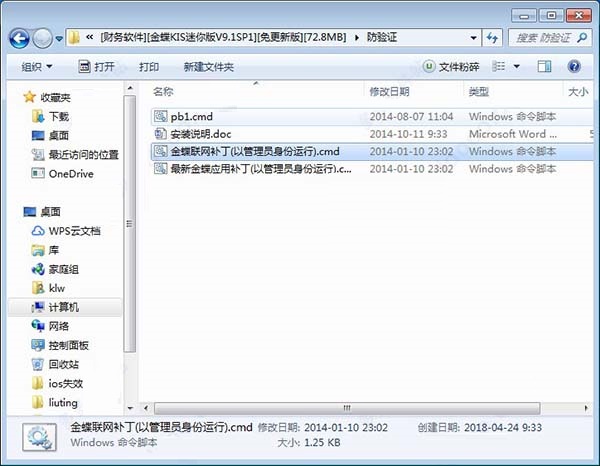 12、最后打开软件包中的防验证文件夹,点击管理员打开其中的金蝶联网补丁(以管理员身份运行).cmd文件然后重启电脑即可完成破解,请注意软件破解成功后不可以升级软件,否则前功尽弃,软件会变成试用版。