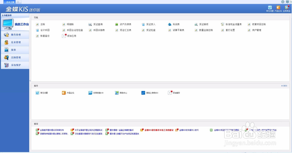 1、先打开金蝶财务软件,你会看到我的工作台,有各种导航,图片类似下面的样式