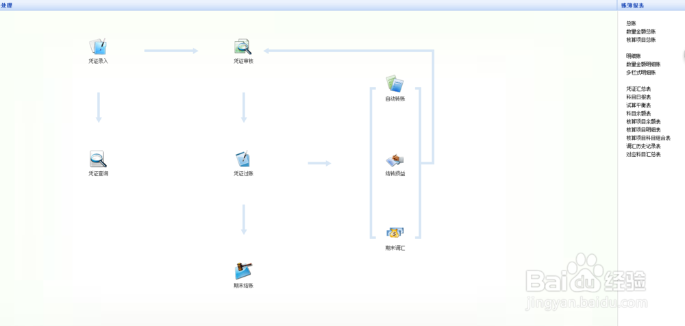 2、平时工作的时候,选择左边的账务处理,你会看到下面这样的页面,然后点击凭证录入,录入凭证的具体内容。