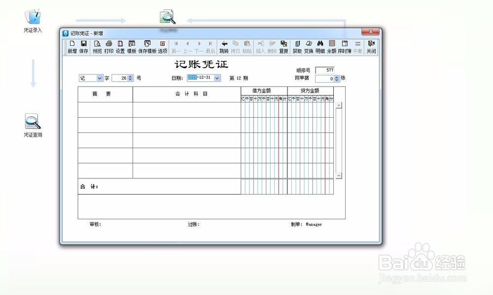 3、你会看到下面一样的空白记账凭证,然后根据公司发生的业务录入数据,