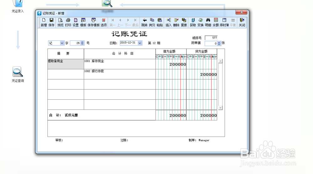 4、如:提取备用金,借:库存现金2000贷:银行存款2000.具体如下,录入完毕,点击保存,然后继续选择下一张。