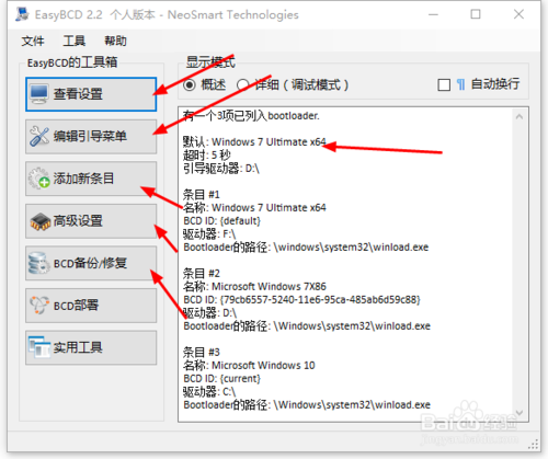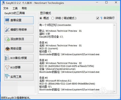 1、尽量使用最新版本,以免EasyBCD使用在不支持的操作系统而导致系统不能启动2、需要引导Windows7系统最好用EasyBCD 2.0 build 76及其更高版本
