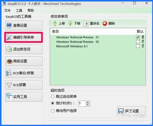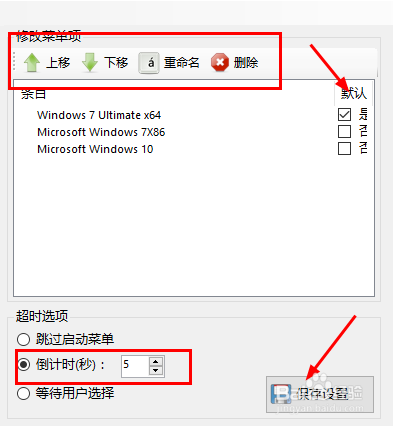 在编辑引导菜单处,你可以上下移动引导项,自定义默认启动项和重命名启动项名称,以及等待时间,最后不要忘了保存设置。