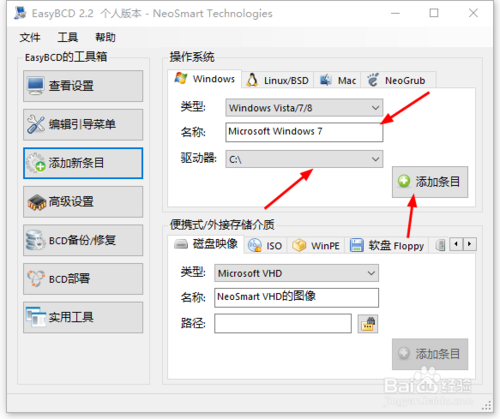 你还可以添加新条目,若你电脑没有某启动项,那就自己添加。选类型,自定义名称,一定要注意驱动器!既是你系统安装的那个盘符。
