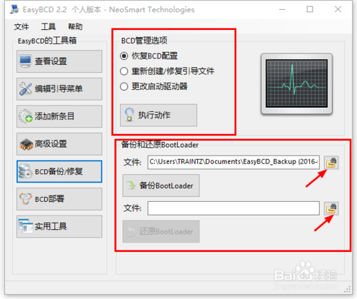 当电脑遇到紧急情况,你还可以还原bcd和备份bcd。若你选择重新创建,一点要去添加新条目,不然电脑将无法启动。