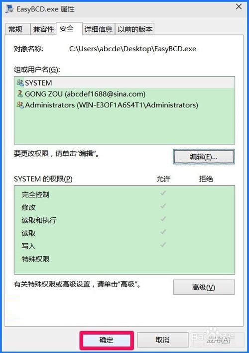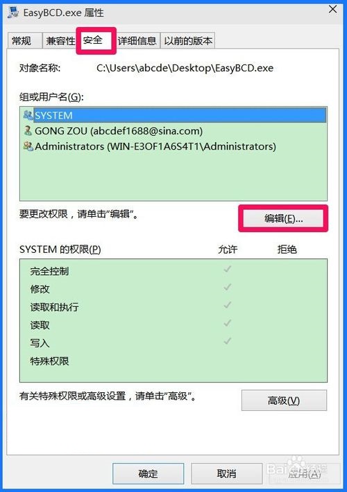 在打开的EasyBCD属性窗口,我们点击:安全,在安全标签下再点击:编辑(E);