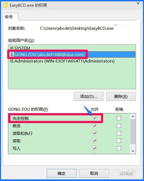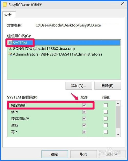 在EasyBCD的权限窗口,左键点击:SYSTEM,在SYSTEM的权限(P)栏的完全控制后的允许复选框内打勾;