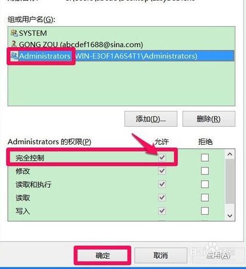 然后我们再点击Administrators,在Administrators的权限(P)栏的完全控制后的允许复选框内打勾,点击:确定;