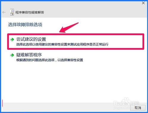 在程序兼容性疑难解答窗口的选择故障排除选项下,我们左键点击:尝试建议的设置;