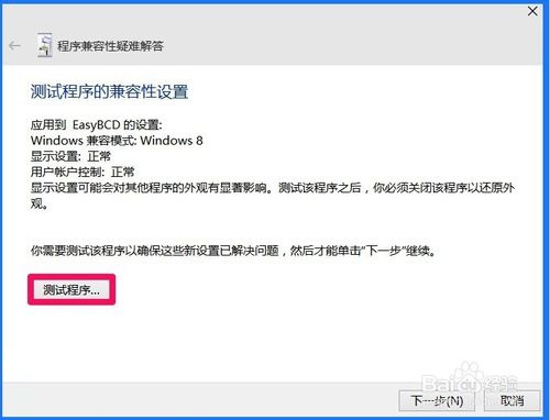 在程序兼容性疑难解答窗口的测试程序的兼容性设置下,我们点击:测试程序;