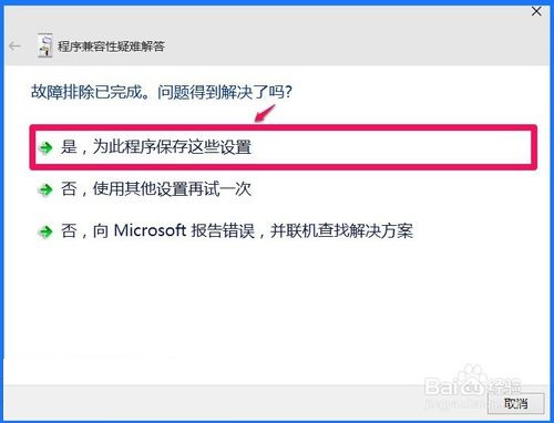 在程序兼容性疑难解答窗口的“故障排除已完成。问题解决了吗?”下面,点击:是,为此程序保存这些设置;