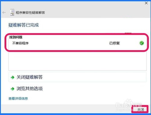 至此,疑难解答已完成,找到问题:不兼容程序,已经修复,我们点击:关闭,退出程序兼容性疑难解答。